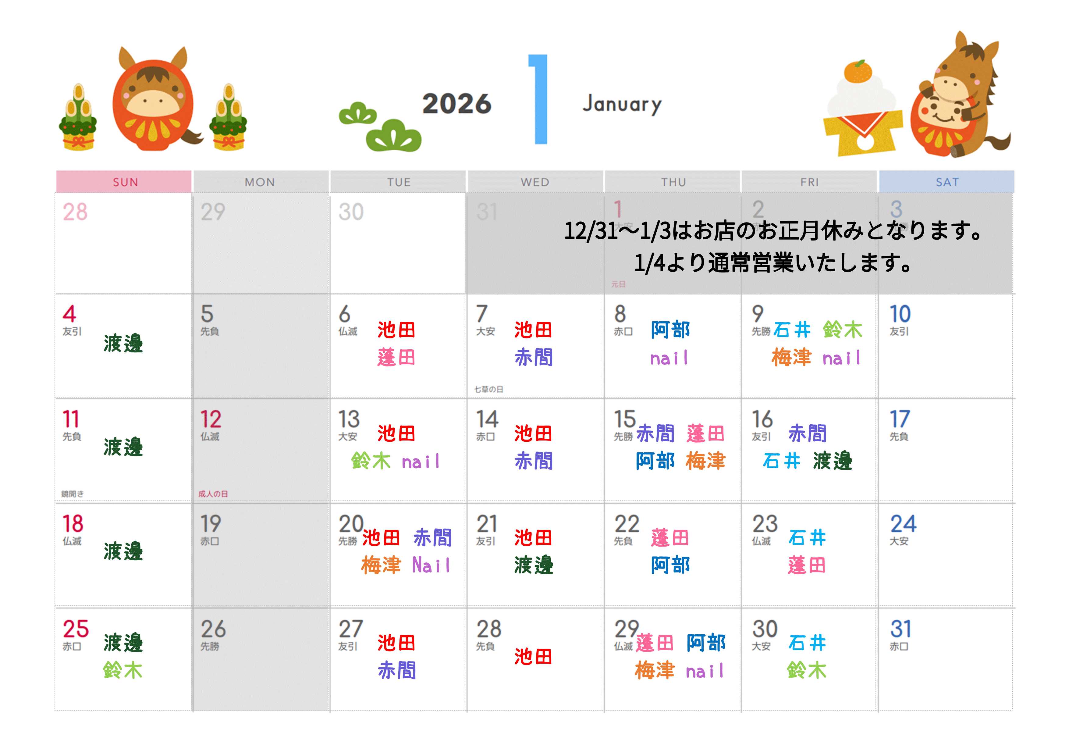 NEWS aria holiday 2024.06.07 ★池田★事務所勤務の為、火・水不在 ★渡邊★日祝定休、10:00~16:00最終受付カラーorパーマ~14:00/カット~15:00★12/31~1/3はお店のお正月休みとなります。